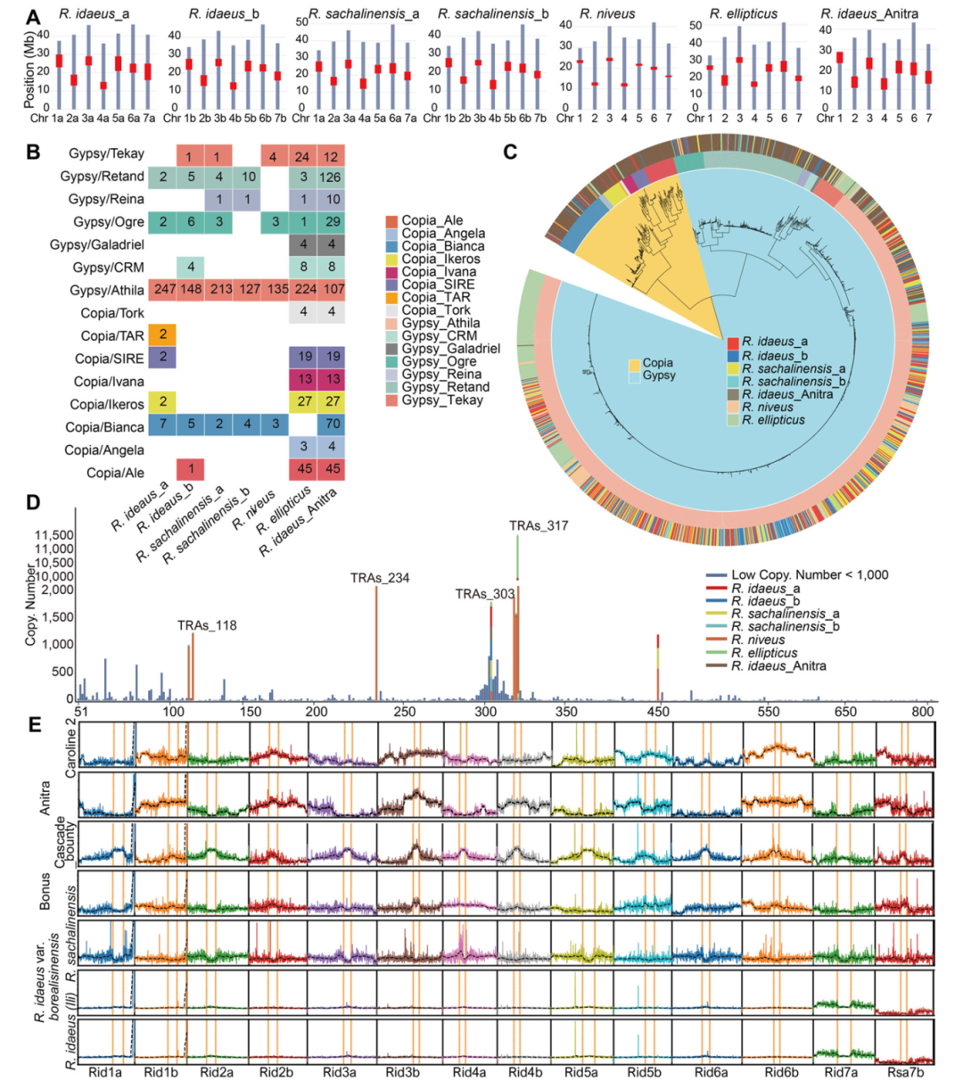 利用SubPhaser v1.24,成功实现R. idaeus(Ili)和R. sachalinensis两种树莓的亚基因组分型,发现亚基因组A或B特异k-mer主要富集于着丝粒区域,其着丝粒序列特征可作为亚基因组分配的潜在标记(图2A-B)。此外,两物种对应的亚基因组在七条染色体上共享着大量古代基因组成分(I or i),LTR-RTs插入时间差异,揭示着不同进化起源,暗示着二者共同祖先可能曾发生过古同倍体杂交事件(图2C)。